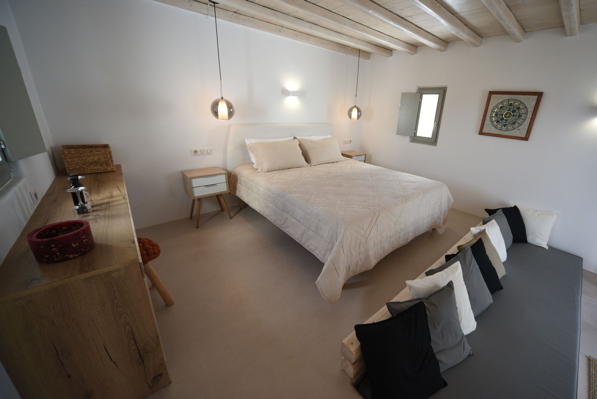 It has a large double bed measuring 1.80 x 2.00 with a 30 cm thick Aloe Vera mattress, a large comfortable sofa bed and a 60 m² private courtyard with a large private jetted tub.