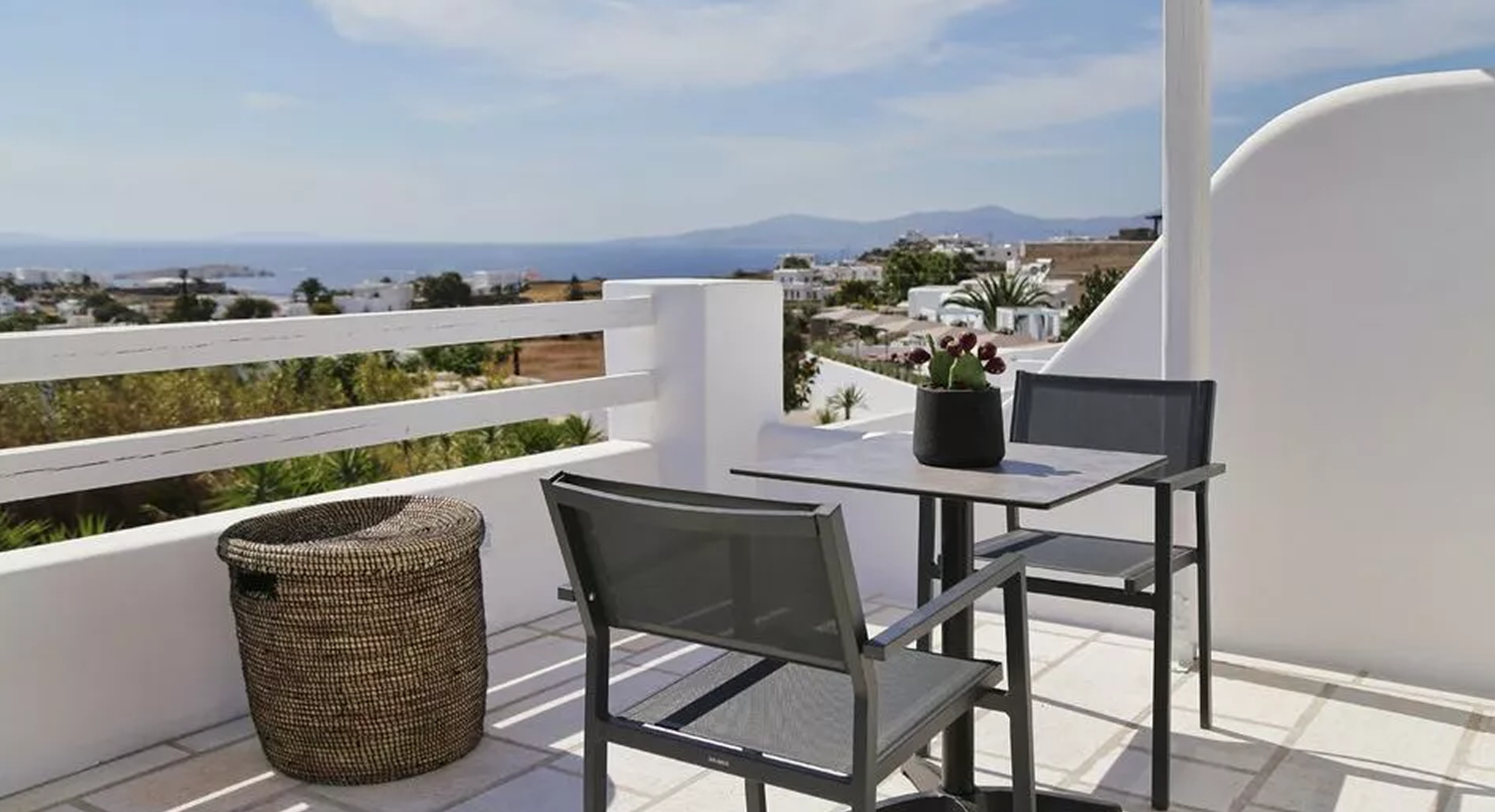 All the light, luxury and finesse of Mykonos are gathered in the Junior Suites of Livin Μykonos Hotel, which offer guests all the modern conveniences. White-washed, with earthy tones and wooden elements, the minimalistic Junior Suites are located in the upper level of the hotel and provide a beautiful view to the sea and the town of the island. The spacious, 30 sq.m., open plan Junior Suites feature a double bed, as well as a comfortable elegant indoor living room and a 40’’TV. Your private balcony promises to offer you countless moments of relaxation and comfort and can be transformed into your own outdoor living room.