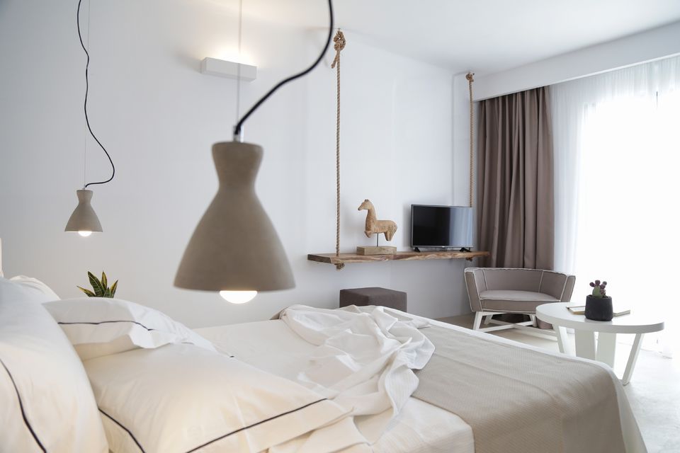 All the light, luxury and finesse of Mykonos are gathered in the Junior Suites of Livin Μykonos Hotel, which offer guests all the modern conveniences. White-washed, with earthy tones and wooden elements, the minimalistic Junior Suites are located in the upper level of the hotel and provide a beautiful view to the sea and the town of the island. The spacious, 30 sq.m., open plan Junior Suites feature a double bed, as well as a comfortable elegant indoor living room and a 40’’TV. Your private balcony promises to offer you countless moments of relaxation and comfort and can be transformed into your own outdoor living room.