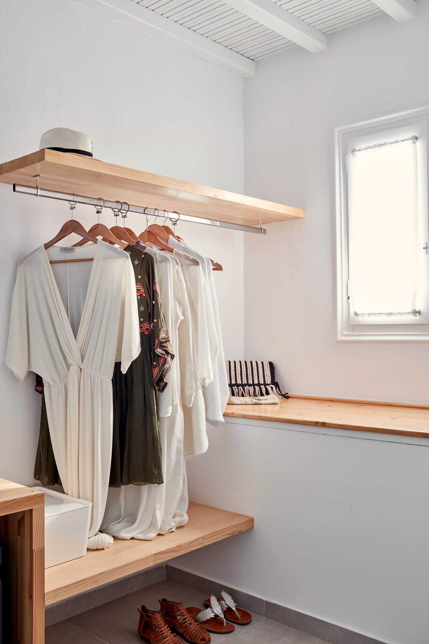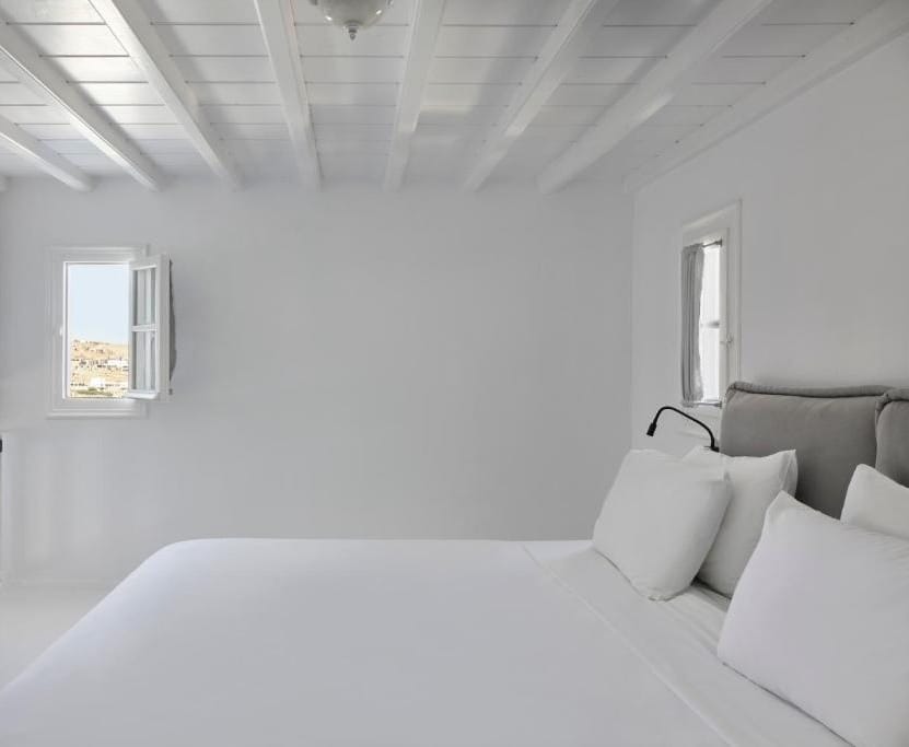 Honeymoon Suite offers a bright and spacious escape with panoramic sea vistas. Featuring floor-to-ceiling windows, a separate living room with a refined design, and a double bed (with select rooms featuring a signature loft), this suite is a haven of light. Enjoy the luxury of an en-suite bathroom with a rain shower and a secluded balcony overlooking the turquoise waters of the Aegean.