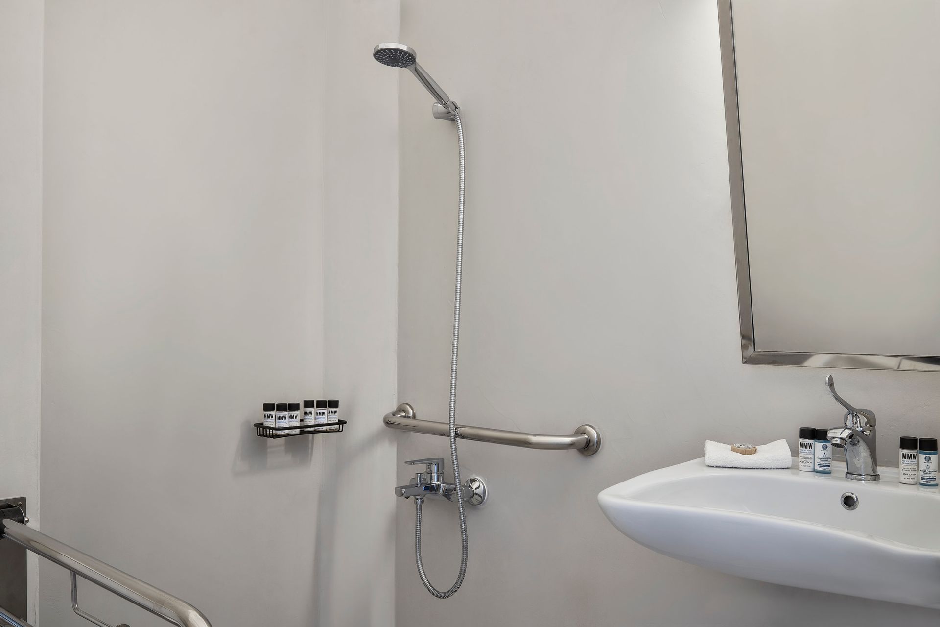 Specially equipped bathroom facilities such as lowered sink, toilet with grab rails, open shower, wider doors. modern bath amenities and a walk-in shower.