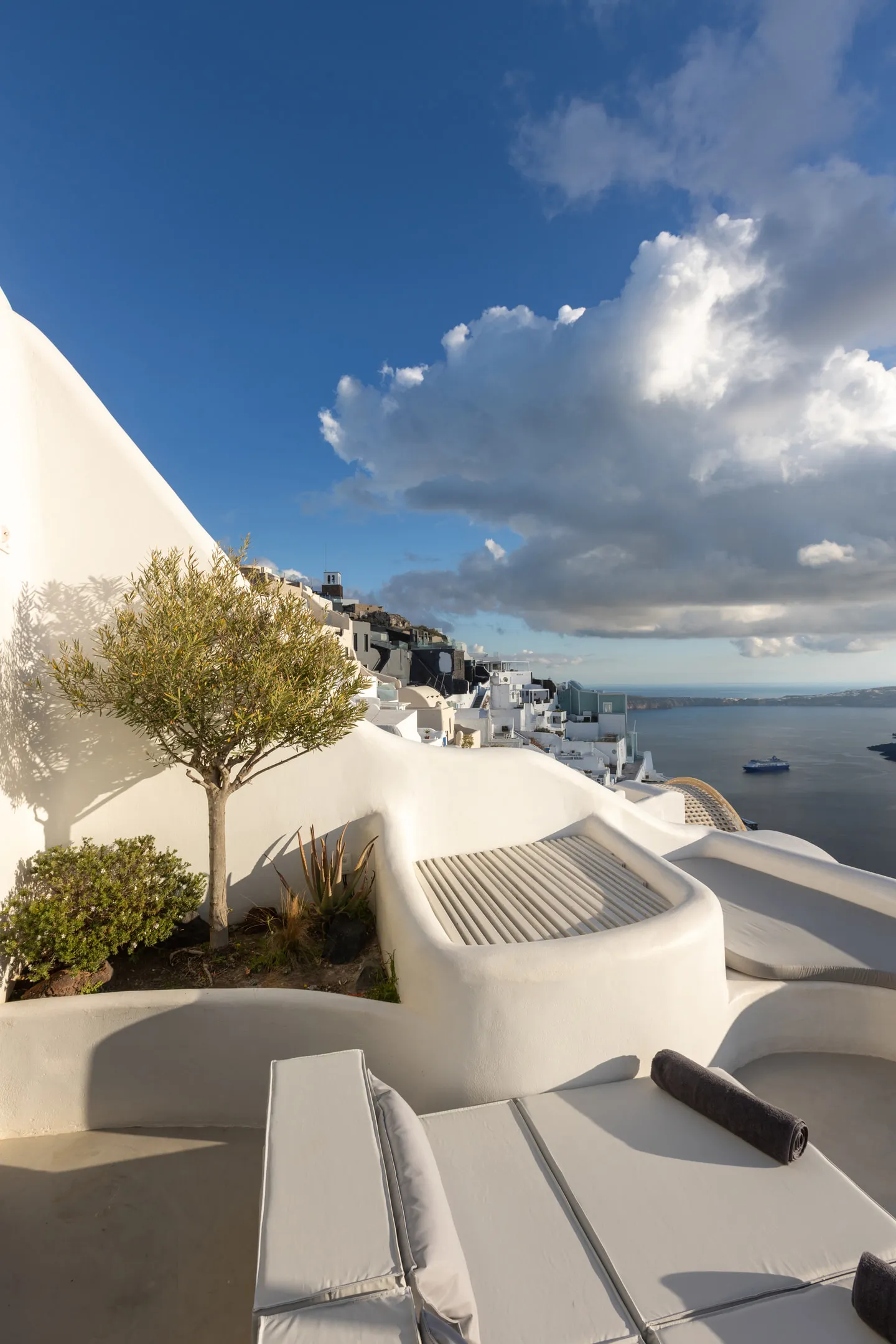 The elegant Deluxe and Superior suites, as well as the Two-Bedroom villa, offer a sanctuary of peace and style. Experience the convenience of the fine-quality mattresses, providing a restful night’s sleep like no other, as well as having an equipped kitchenette at your disposal, allowing you to effortlessly prepare meals for you and your loved ones. Step outside onto your private terrace to discover the rejuvenating outdoor hot tub or plunge pool, where you can unwind as you soak in the panoramic vistas of the caldera and the azure Aegean Sea.