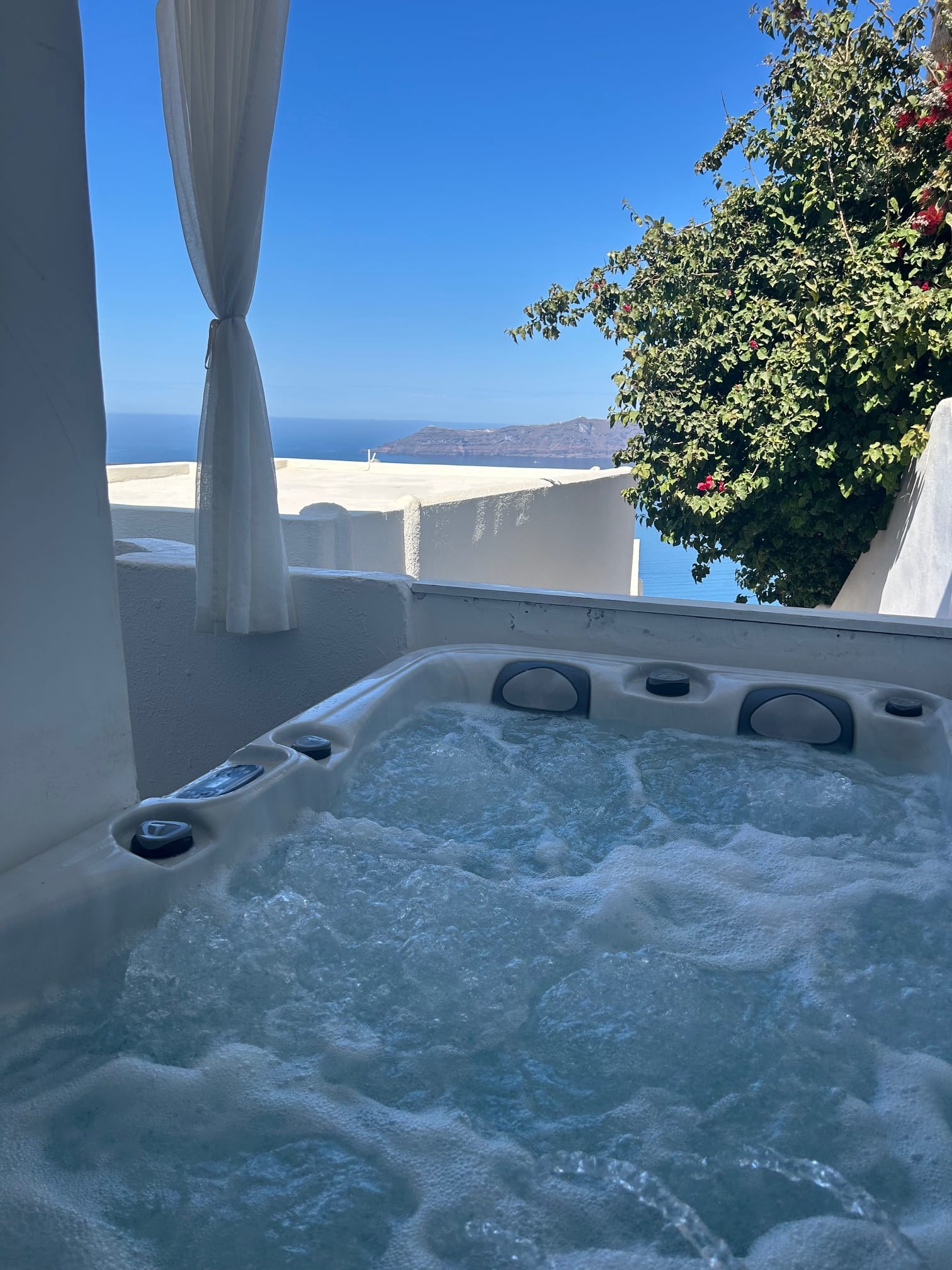 Delight in the spacious Studio with Outdoor Jetted Tub Caldera View, elegantly decorated in light tones of white. The room features an open-plan bedroom and a separate marble w/c with a shower. Relax on the Cocomat™ top-mattress on your queen-sized bed and sip your drinks on the veranda with private jetted tub and overlooking the Aegean and direct access to the main pool.