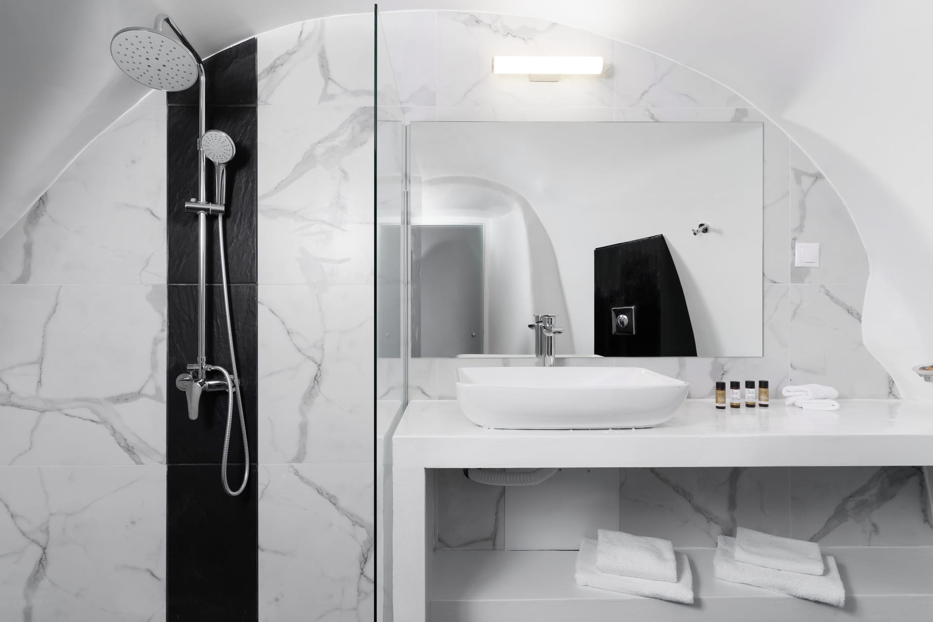 Spoil yourself with an outdoor Jet Tub on a private veranda overlooking the Caldera. Reflecting the authentic Santorini aesthetics, the Traditional Suite boasts a queen-sized bed with Cocomat™ top-mattress that upgrades your sleep, a marble w/c with a shower, and a living room area .