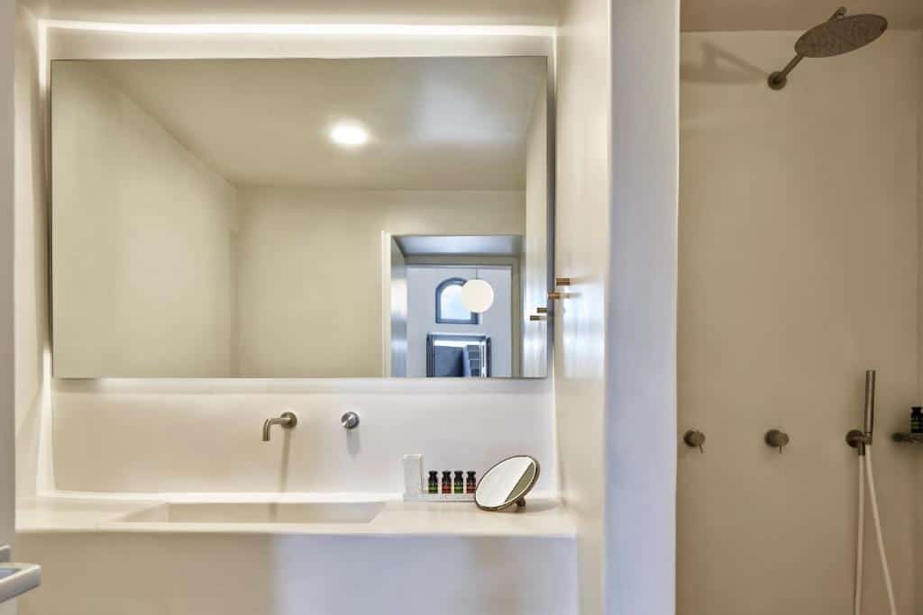 Elegant Junior Cave Suite with sea view and jetted tub in Cyclades. Perfect for a luxurious stay at.