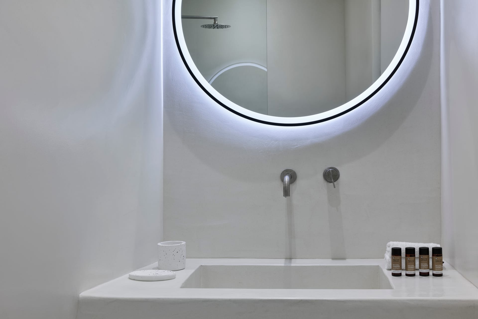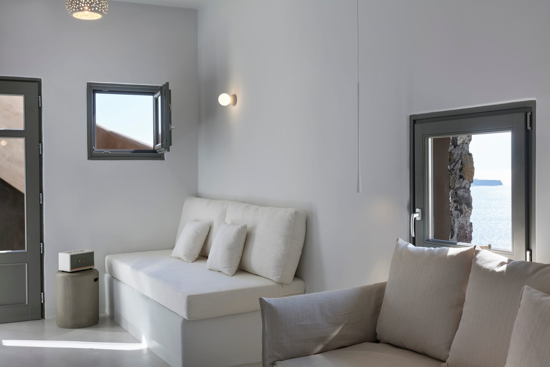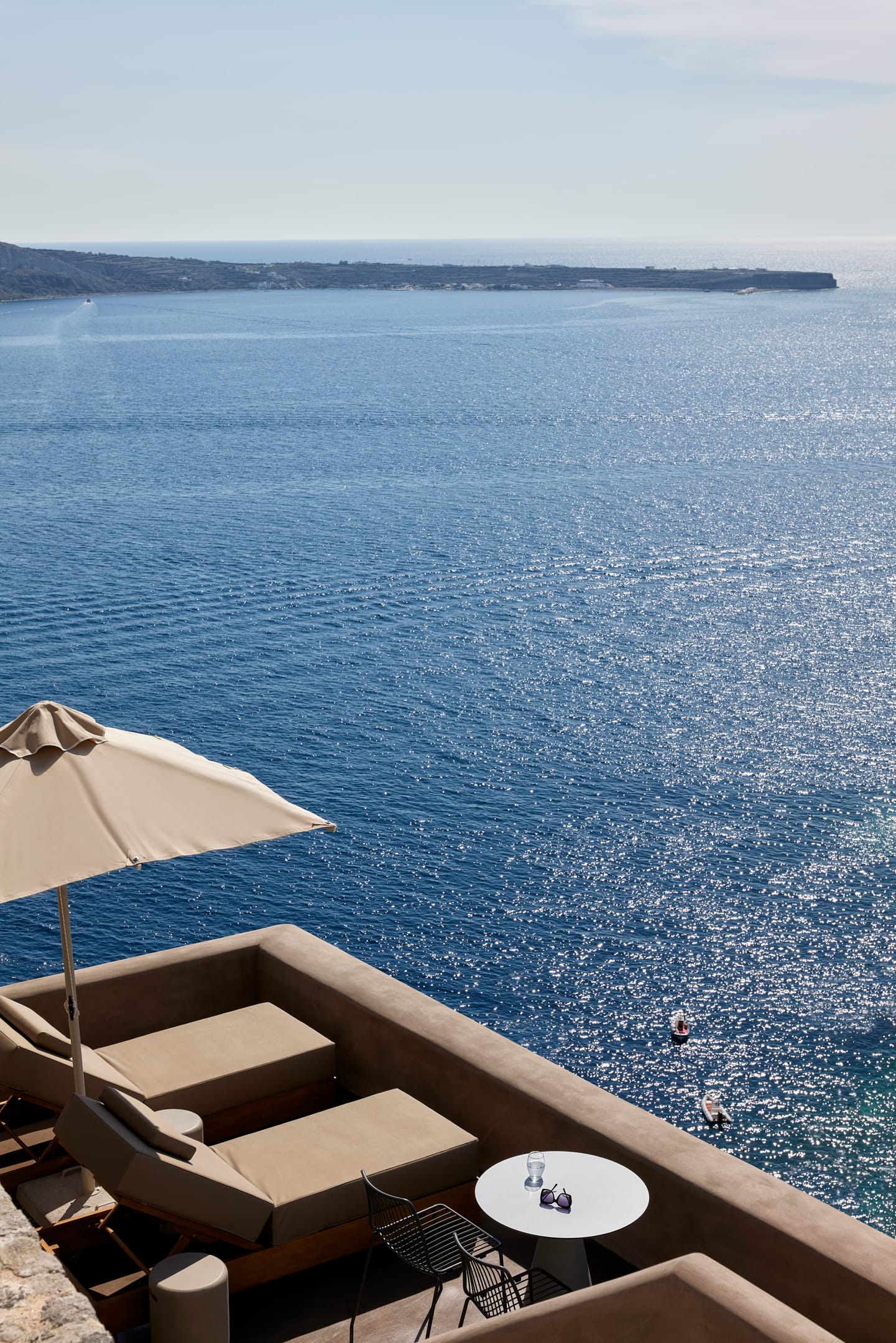 38m2, accommodates up to 4 Guests and features one Master Bedroom with one queen size bed and a living room with two sofa beds. Each bedroom has an ensuite bathroom with a shower. The Suite has also an open air rooftop terrace with heated Pool with Jetts & Sea View.