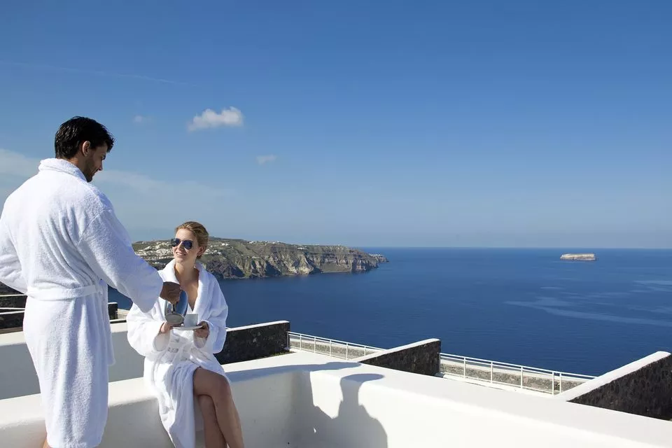 If you choose a civil wedding again we can create the perfect backdrop at the external area next to the poolwith unrivaled views that will magnify all the eyes. The outdoor reception area allows you to organize your wedding uniquely for you and your guests. The closed banquet room is at your disposal if the weather is not ideal. The well-equipped Thermes bar is waiting for you to have fun with your loved ones at a pre or after wedding party with many surprises. In all of the above comes the collaboration with selected catering that will impress your guests with their special creations, special visuals and lighting effects that will give impressive moments, fireworks show, contemporary sound coverage, themed events you like. The admittedly unique aesthetic spa by Thermes awaits the future bride and her girlfriends for moments of relaxation and well-being before the big moment. Our private helicopter ready to give you an unforgettable experience making a romantic sight-seeing over Santorini! Your moment is important. Together we will make it unique!