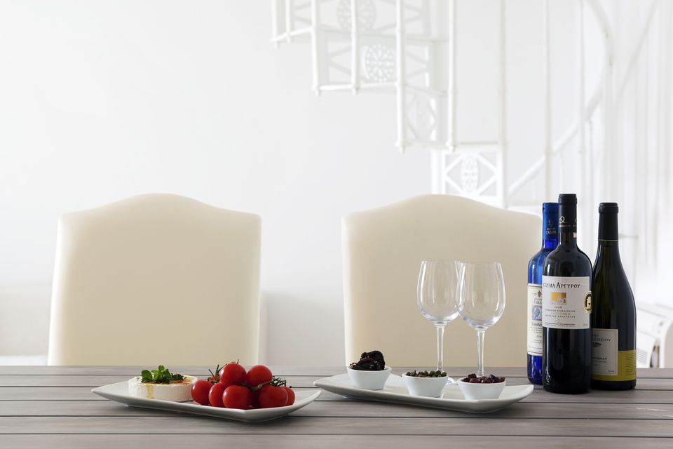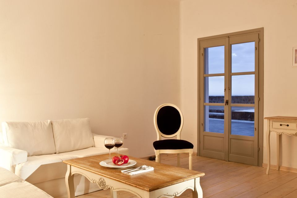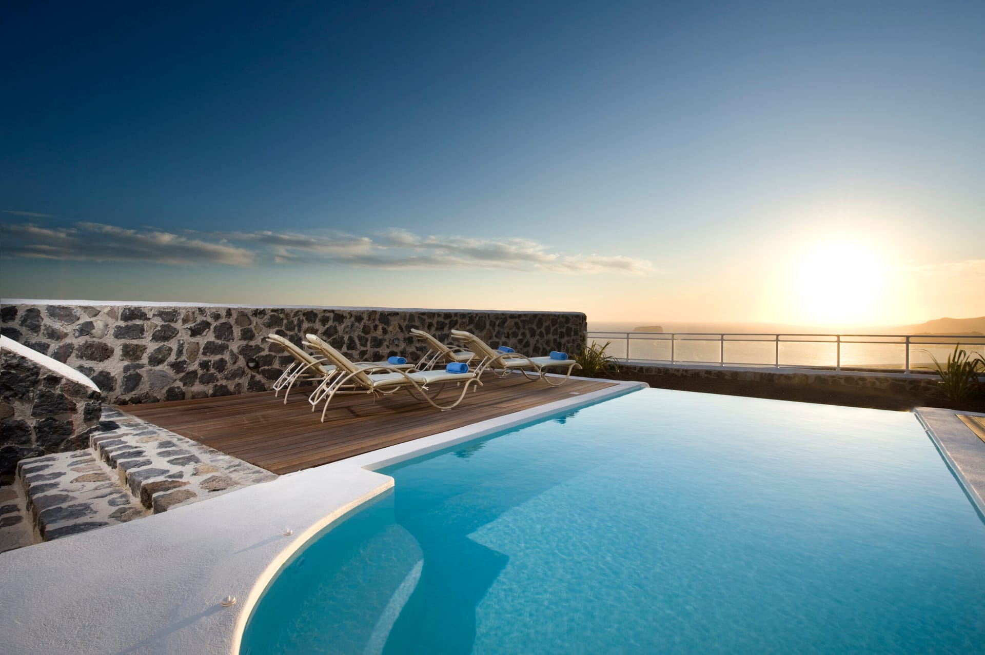Our verandas are equipped with wooden furniture and sun loungers, next to the villa’s private swimming pool, with a unique view to the volcano and the Caldera.